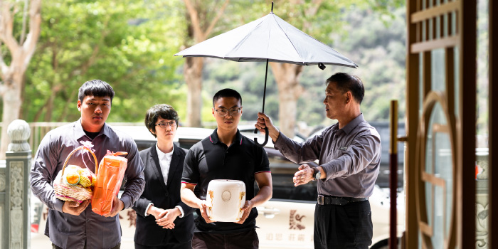 ash placement由客服人員撐黑傘,引導晉塔之家屬至晉塔廳並擺設祭品與點香,晉塔儀式進行,師父或道士誦完經後,再由客服人員引導至塔位區安厝;櫃位內可搭配天堂家小物擺設,讓家屬更可以懷念先人或幫先人圓夢。